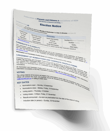 P&C Federation conducts its elections every two years. Directors and Delegates can stand for re-election as long as they continue to be eligible.